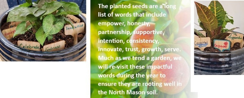 As we always do in the weeks leading to the start of school, the district holds several training and leadership sessions to assist our educators in creating a unified vision for the year ahead. In one such session, the district and building administration spent some time reflecting on what values they want to instill in our students. They chose impact words to describe ways of “building our garden and developing our soil.” The words ended up on little signs and were then placed in two planters. These plants, and the focused messaging of all this reflection, now reside in the district office; a symbol of the attributes we are growing in our garden here at North Mason.